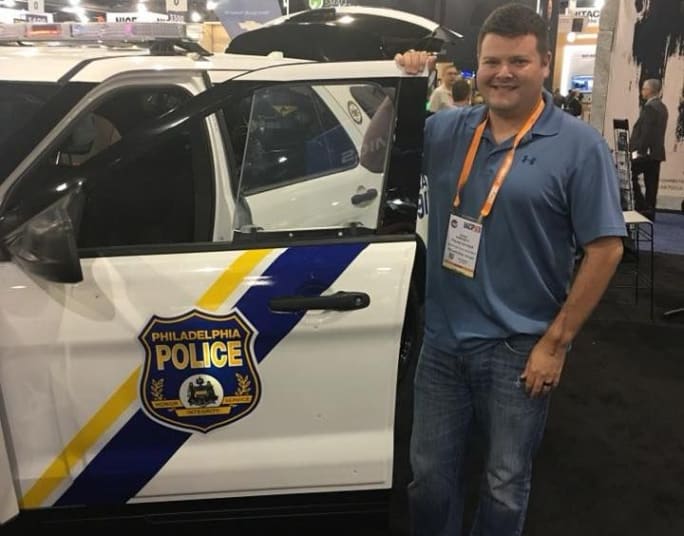 Philadelphia patrol officer Jesse Hartnett stands next to a city police vehicle armored with Hardwire's B-Kit. He was ambushed and seriously wounded inside his patrol vehicle in 2016, spurring the separtmetn to add armor.