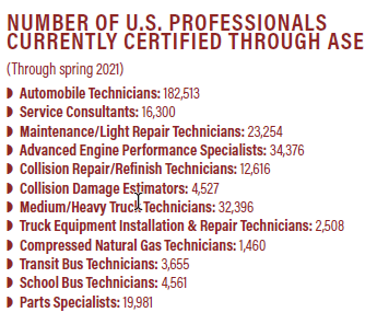 In addition to individual ASE certifications, techs can earn a master’s level certification. For automobiles or medium- and heavy-duty trucks, that requires the tech to earn seven or eight individual certifications.