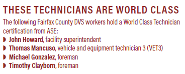 Another class of ASE is called World Class Technician, with about 2,000 technicians earning that status since its inception about 30 years ago. Four Fairfax County Department of Vehicle Services techs hold that certification, which requires 22 specific ASE certifications and masters certifications in six areas.
