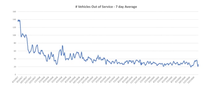 One of its most impressive improvements is reducing vehicle out-of-service levels by a factor of four. Joishy receives daily report on out-of-service vehicles at 3:30 p.m. every weekday — like at New York City, his former employer. When he first set this up, he was seeing about 140 vehicles out of service every day; this number has decreased to 30-40.