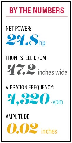 Powered by a 24.8-hp Kubota diesel engine that meets Tier 4 Final emissions standards without a diesel particulate filter, the roller features a 47.2-inch-wide front steel drum plus 4,320-vpm vibration frequency and amplitude of 0.02 inches. An ergonomic control panel layout with clear symbols and one switch/one function operation provides intuitive roller control.