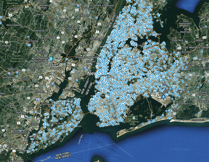 More than 23,000 of NYC’s assets have telematics systems installed. Each blue dot represents a vehicle equipped with telematics, spread across the city.