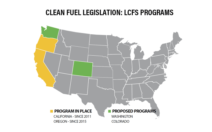 Clean Fuel Legislation: LCFS Programs Low-carbon fuel standard (LCFS) programs mandate the use of low-carbon fuels — alternative fuels that burn cleaner than fossil fuels, such as renewable diesel. The goal is to decrease carbon dioxide emissions from vehicles and reduce the carbon footprint of transportation. These standards require fleets to look for cleaner fuel solutions and can have an impact on pricing and availability in these areas.