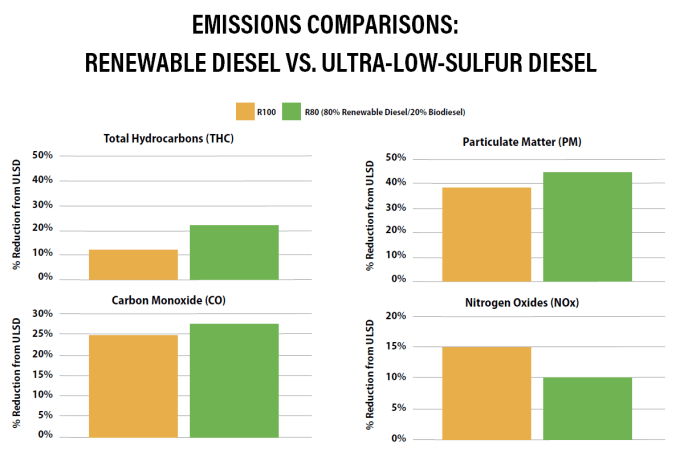 The specialized processes used to produce renewable diesel deliver near zero contaminants and other benefits, such as: It can be used as a drop-in replacement for ultra-low-sulfur diesel and biodiesel, reduces greenhouse gas (CO2) emissions by 80%, has 24% lower carbon monoxide levels, and it’s a high cetane fuel, which is good for greater pickup, cold start, and quieter operation, according to Neste.