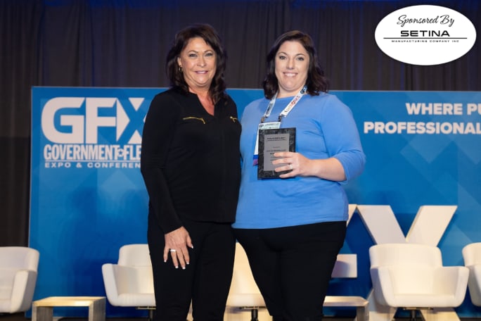 Fleet Superintendent (right) Megan Stuart manages a team of about three dozen employees who service city fleet vehicles. She is pictured here with Setina Manufacturing Vice President Judy Setina receiving the award.
