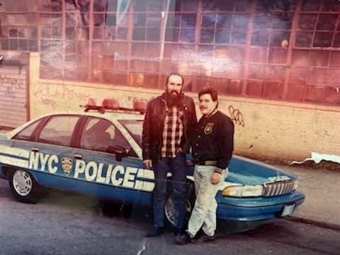 Martinez stands with his then-supervisor in front of a 1991 Chevy Caprice, NYPD’s first patrol vehicle with the new vision bar and decal scheme he developed.