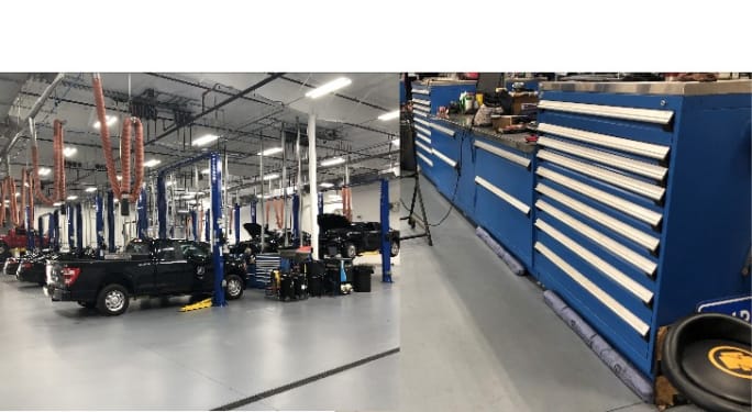 The new shop has 17 bays shared among 12 technicians. The shop also has new technician toolboxes.