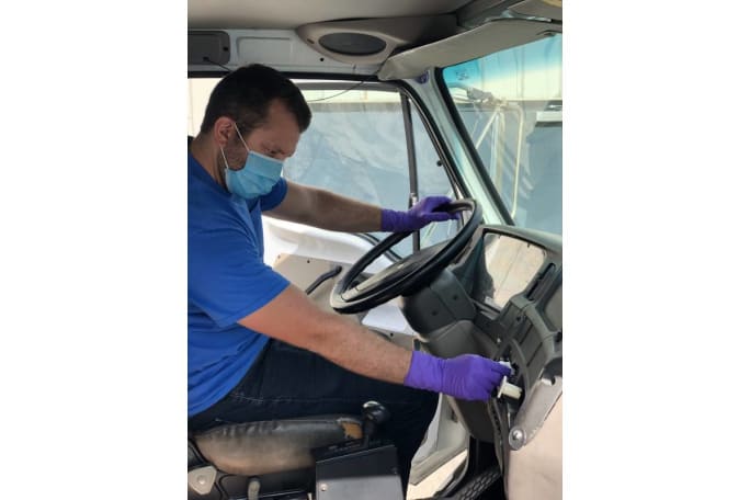 Chad Yeager of JEA thoroughly cleaning and sanitizing a vehicle.