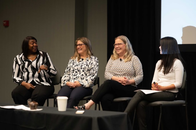 (From left) Makela Akinwunmi, Sherri Irwin, Kathy Wellik, and Thi Dao discuss women in public fleet management at a learning and networking session.