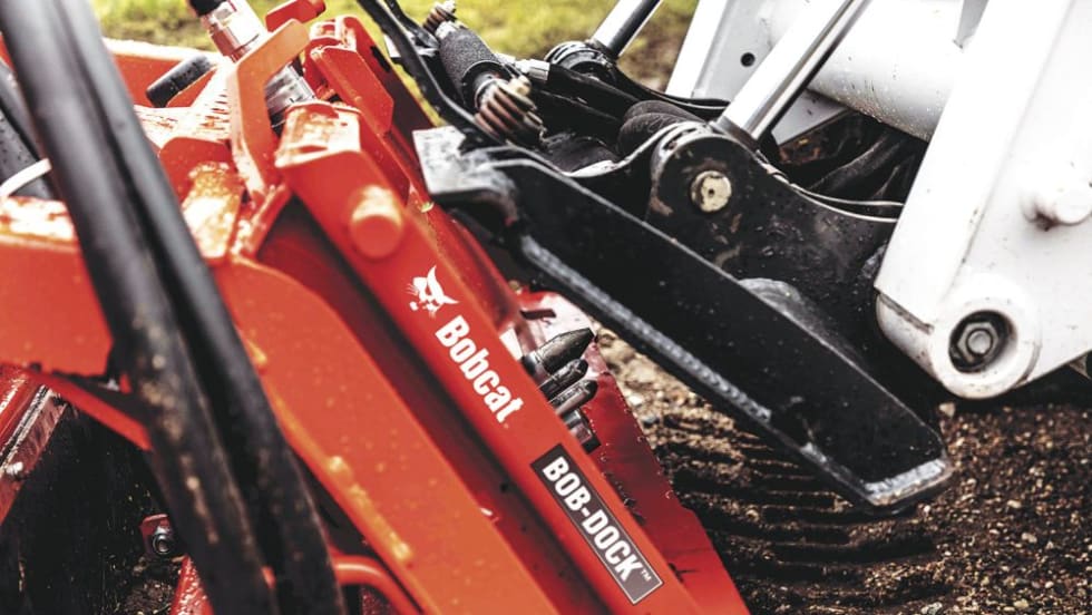 The Bob-Dock attachment mounting system for Bobcat loaders allows the operator to remain in the cab when changing attachments.