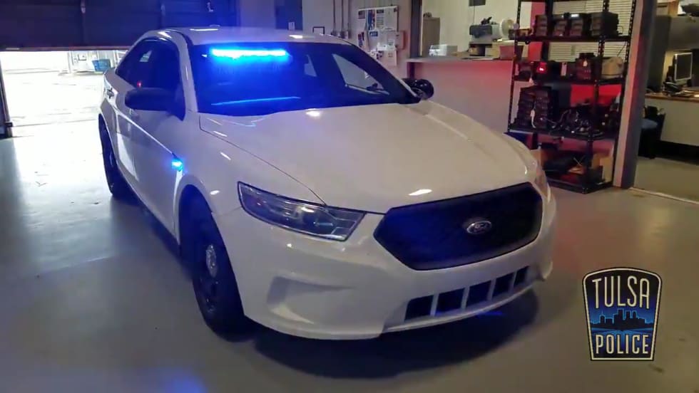 The Tulsa Police Department offered a walkaround of an unmarked police car, explaining the equipment fitted onto the vehicle as mandated by state statute for traffic enforcement.
