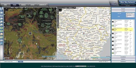 Same Page, Multiple Maps: All assets can be tracked on one map, or each geographic area can be viewed on separate maps. Both street and aerial (image) views are available for any area in the world. Users of Blue Sky Network's HawkEye 5300 dual-mode tracking devices can also see which network—GSM or Iridium—provided position and event data, which allows a seamless view of network coverage for planning purposes.
