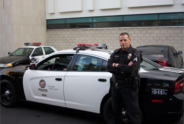 LAPD Sgt. Joel Miller poses next to an LAPD Dodge Charger Pursuit. Photo by Blake Bobit.