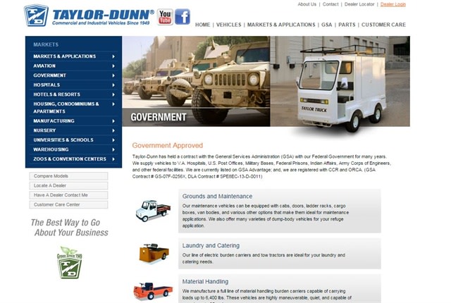 For the government market, Taylor-Dunn provides vehicles for grounds and maintenance, laundry and catering, material handling, security, and towing trailers and carts. The company has a contract with the U.S. General Services Administration (GSA), supplying vehicles to Veterans Affairs hospitals, U.S. Post Offices, military bases, federal prisons, Indian Affairs, and the Army Corps of Engineers, according to its website.