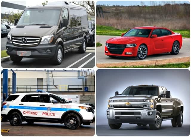 (Clockwise from top left) 2014-MY Sprinter; 2015 Dodge Charger; MY-2015 Chevrolet Silverado 3500HD; Chicago Police Department's P.I. Utility