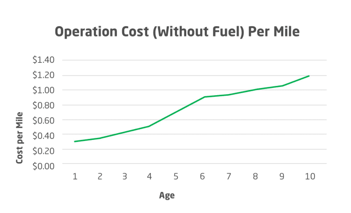 The company found that operating cost (without fuel) increases more than expected as the vehicles age. In its first year, bucket truck operating costs average $0.31 per mile, a number that rises to $1.19 per mile by year 10. This represents a $0.88 per mile increase over the 10-year period.