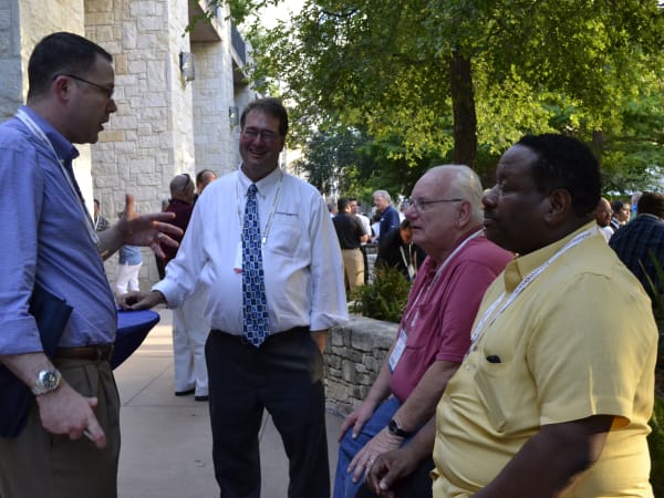 Larry Campbell of Fort Wayne, Ind., talks to colleagues and a Faster representative on the show floor.