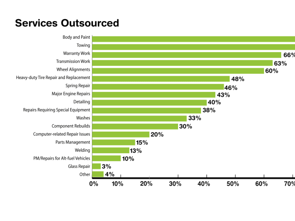 Fleet managers balance the work they do in-house with the staff they have with work that is more time-consuming, specialized, or requires special tools or equipment that they outsource. This chart shows the most commonly outsourced services.  Responses in the “Other” category include upholstery work, police upfitting, and biocleaning.
