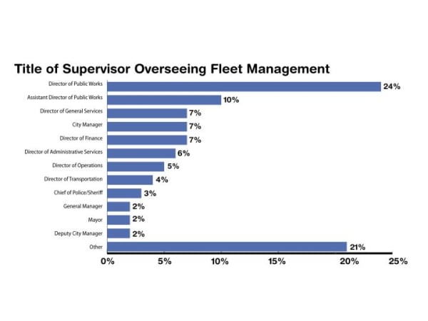 Director of Public Works is the mostcommon title of the person overseeing fleet management. This data is calculated from actual titles. Variances  are often included in the "Other" category.