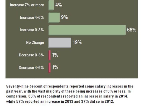 Seventy-nine percent of respondents reported some salary increases in the past year, with the vast majority of these being increases of 3% or less. In comparison, 63% of respondents reported an increase in salary in 2014, while 57% reported an increase in 2013 and 37% did so in 2012.