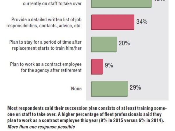 Most respondents said their succession plan consists of at least training someone on staff to take over. A higher percentage of fleet professionals said they plan to work as a contract employee this year (9% in 2015 versus 6% in 2014). More than one response possible.