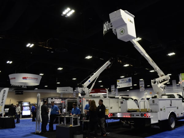 Altec's booth featured its fiberglass mechanics truck (left) and AT40G JEMS 4E4 telescopic articulating aerial device with jobsite energy mangement system (right).