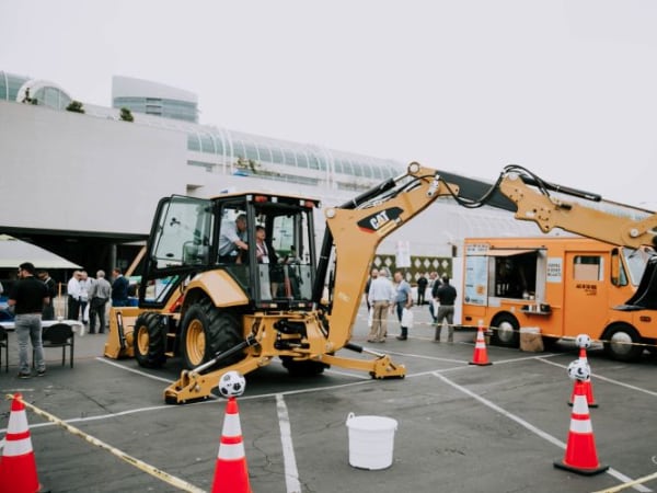 Caterpillar hosted a game, where attendees attempt to pick up a soccer ball and drop it in a basket.