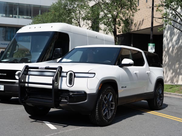 Talk about a pairing. Rivian vehicles sitting pretty in the parking lot.