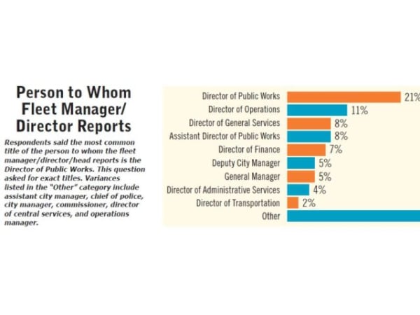 Respondents said the most common title of the person to whom the fleet manager/director/head reports is the Director of Public Works. This question asked for exact titles. Variances listed in the “Other” category include assistant city manager, chief of police, city manager, commissioner, director of central services, and operations manager.