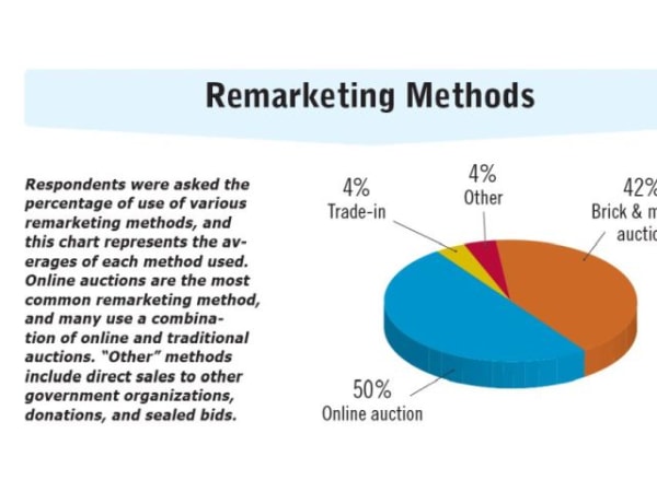 Respondents were asked the percentage of use of various remarketing methods, and this chart represents the averages of each method used. Online auctions are the most common remarketing method, and many use a combination of online and traditional auctions. “Other” methods include direct sales to other government organizations, donations, and sealed bids.