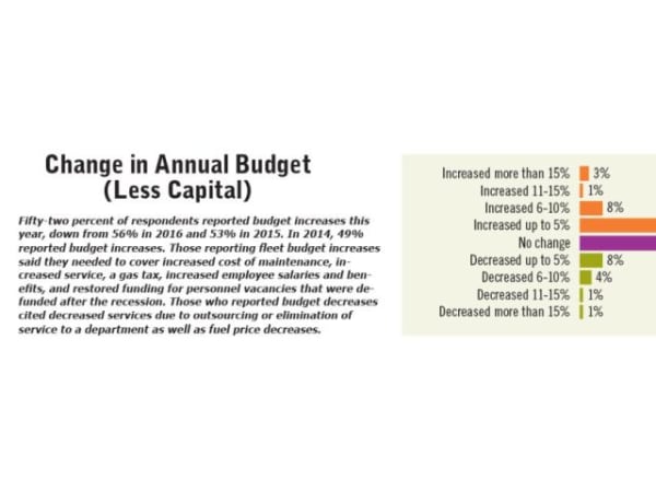 Fifty-two percent of respondents reported budget increases this year, down from 56% in 2016 and 53% in 2015. In 2014, 49% reported budget increases. Those reporting fleet budget increases said they needed to cover increased cost of maintenance, increased service, a gas tax, increased employee salaries and benefits, and restored funding for personnel vacancies that were defunded after the recession. Those who reported budget decreases cited decreased services due to outsourcing or elimination of service to a department as well as fuel price decreases.