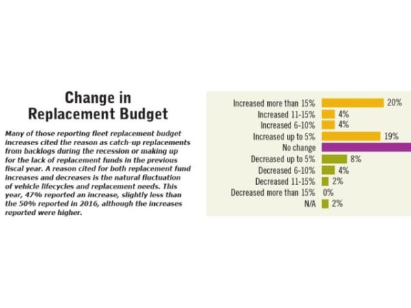 Many of those reporting fleet replacement budget increases cited the reason as catch-up replacements from backlogs during the recession or making up for the lack of replacement funds in the previous fiscal year. A reason cited for both replacement fund increases and decreases is the natural fluctuation of vehicle lifecycles and replacement needs. This year, 47% reported an increase, slightly less than the 50% reported in 2016, although the increases reported were higher.