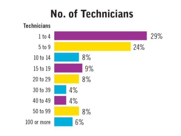 More than half of survey respondents reported having fewer than 10 technicians. Those with no technicians were not included in this chart.