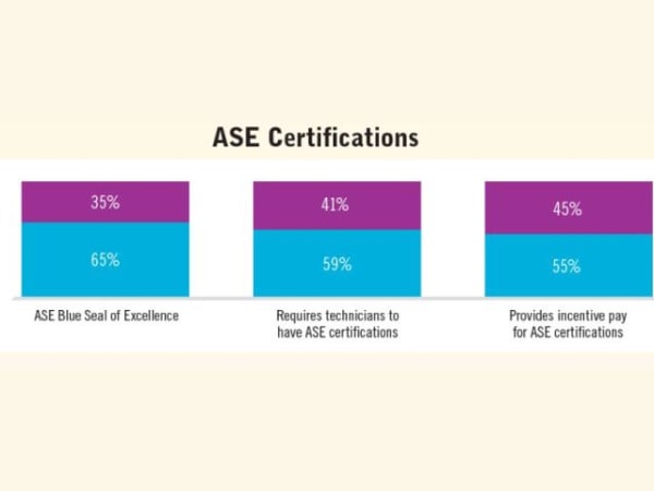About one third of those surveyed said their shops have ASE (National Institute for Automotive Service Excellence) Blue Seal certifications. Of those fleets that have ASE Blue Seals, 67% require technicians to have ASE certifications and 63% provide incentive pay for ASE certifications.