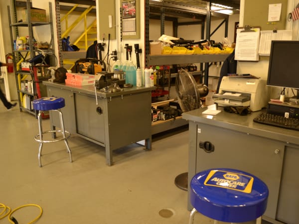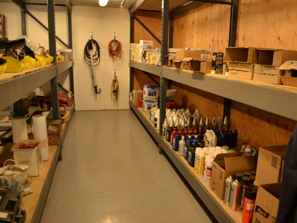 The fleet carries about $7,500 in parts inventory, stored in the pictured parts room.