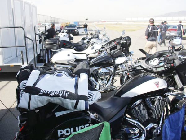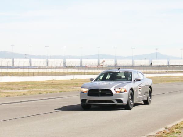 A Dodge Charger Pursuit and Chevrolet Caprice finish their test laps at the same time.