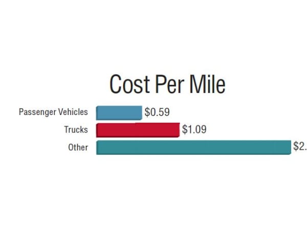 Cost per mile for passenger vehicles and trucks has decreased from 2014, while CPM for "other" vehicles increased from $2.29 in 2014.