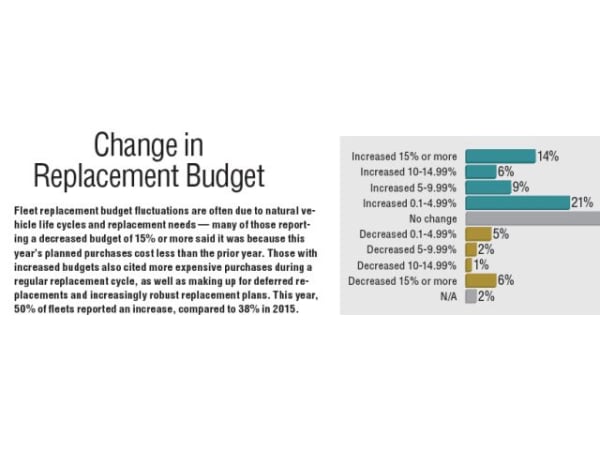 year’s planned purchases cost less than the prior year. Those with increased budgets also cited more expensive purchases during a regular replacement cycle, as well as making up for deferred replacements and increasingly robust replacement plans. This year, 50% of fleets reported an increase, compared to 38% in 2015.
