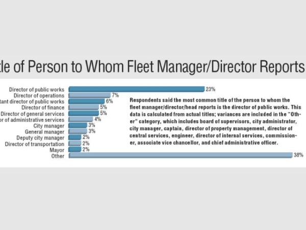 Respondents said the most common title of the person to whom the fleet manager/director/head reports is the director of public works. This data is calculated from actual titles; variances are included in the “Other” category, which includes board of supervisors, city administrator, city manager, captain, director of property management, director of central services, engineer, director of internal services, commissioner, associate vice chancellor, and chief administrative officer.