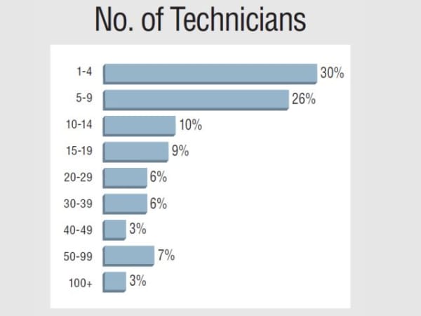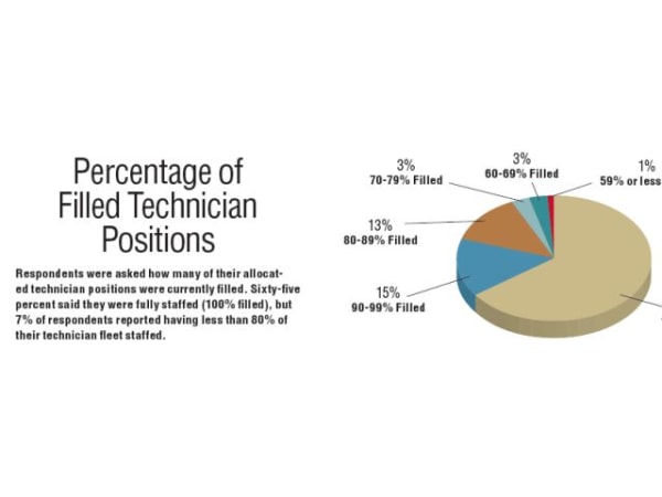 Respondents were asked how many of their allocated technician positions were currently filled. Sixty-five percent said they were fully staffed (100% filled), but 7% of respondents reported having less than 80% of their technician fleet staffed.