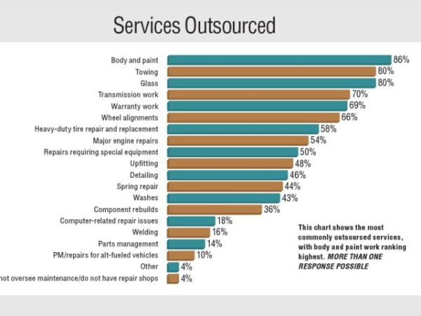 This chart shows the most commonly outsourced services, with body and paint work ranking highest. More than one response possible
