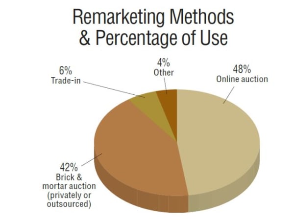 Respondents were asked the percentage of use of various remarketing methods, and the chart above represents the averages of each method used. Online auctions are the most common remarketing method. “Other” methods include sealed bid, donation or sale to other agencies, destruction, lease return, and scrap recycling.