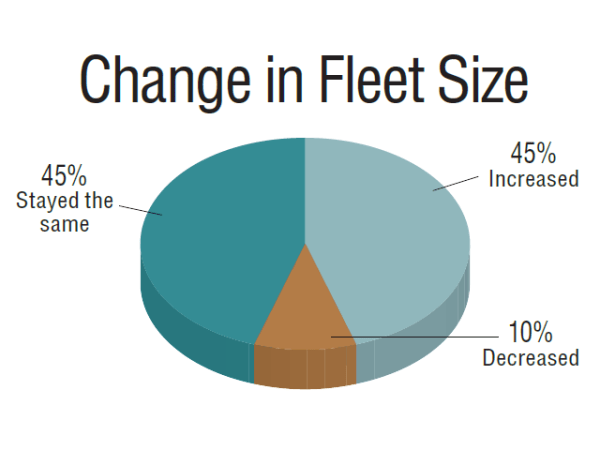 Fleet respondents were asked how their fleet size had changed in the past year. A slightly higher percentage reported an increase this year: 45% compared to 42% in 2015 and 36% in 2014. Those reporting fleet size decreases reduced, with 10% this year, 12% in 2015, and 14% in 2014. Those who had reduced their fleet size cited fleet reduction efforts and decreased transportation requirements. Those with increased fleet sizes cited growing agencies and departments as well as growing transportation demands.