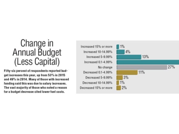 Fifty-six percent of respondents reported budget increases this year, up from 53% in 2015 and 49% in 2014. Many of those with increased funding said this was due to salary increases. The vast majority of those who noted a reason for a budget decrease cited lower fuel costs.