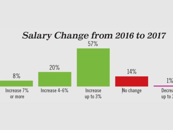 Eighty-five percent of respondents reported an increase in salary in 2017 from the prior year compared to 79% in 2015. In addition, the increases reported were higher.