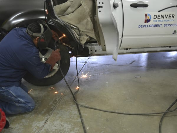 Desi Apodaca, the fleet's welder, is pictured at work on a vehicle.