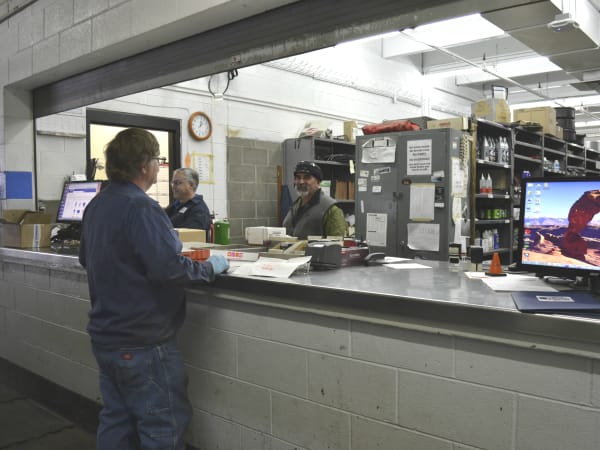 Tommy Phillips is pictured interacting with parts room staff members (l-r) Michael Brosh and Victor Martinez.