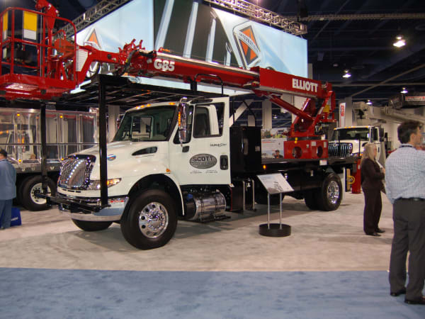 This International DuraStar is upfitted with an Elliott HiReach aerial work platform.