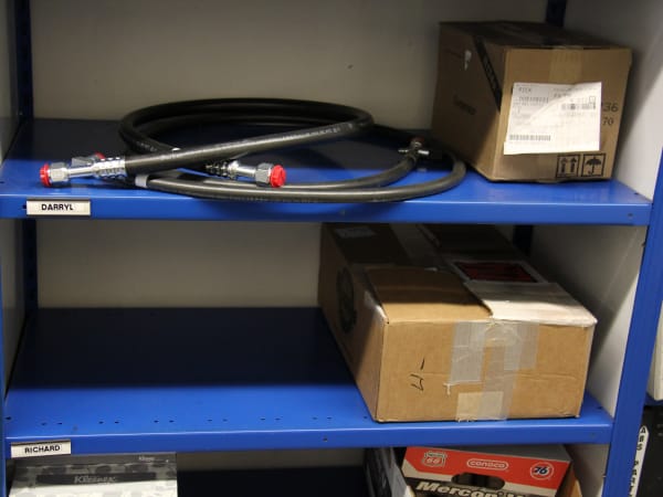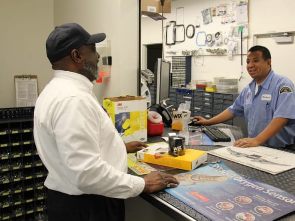 Richard Luna (right), a mechanical stock clerk II, fields requests at the parts room counter.
