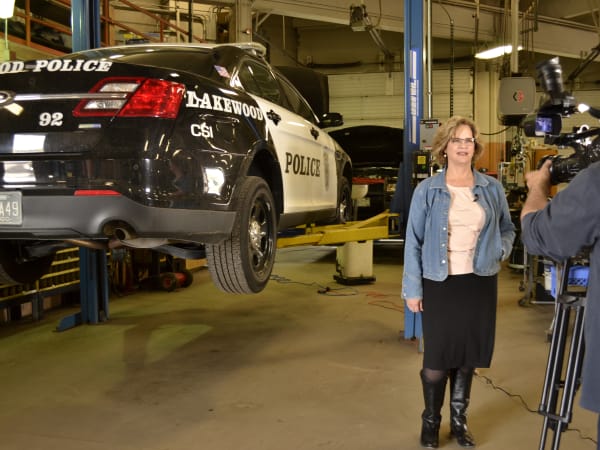 Nina Hoffert, fleet manager for the City of Lakewood, talks in front of the camera about the city fleet. She began her career on the administrative side.
